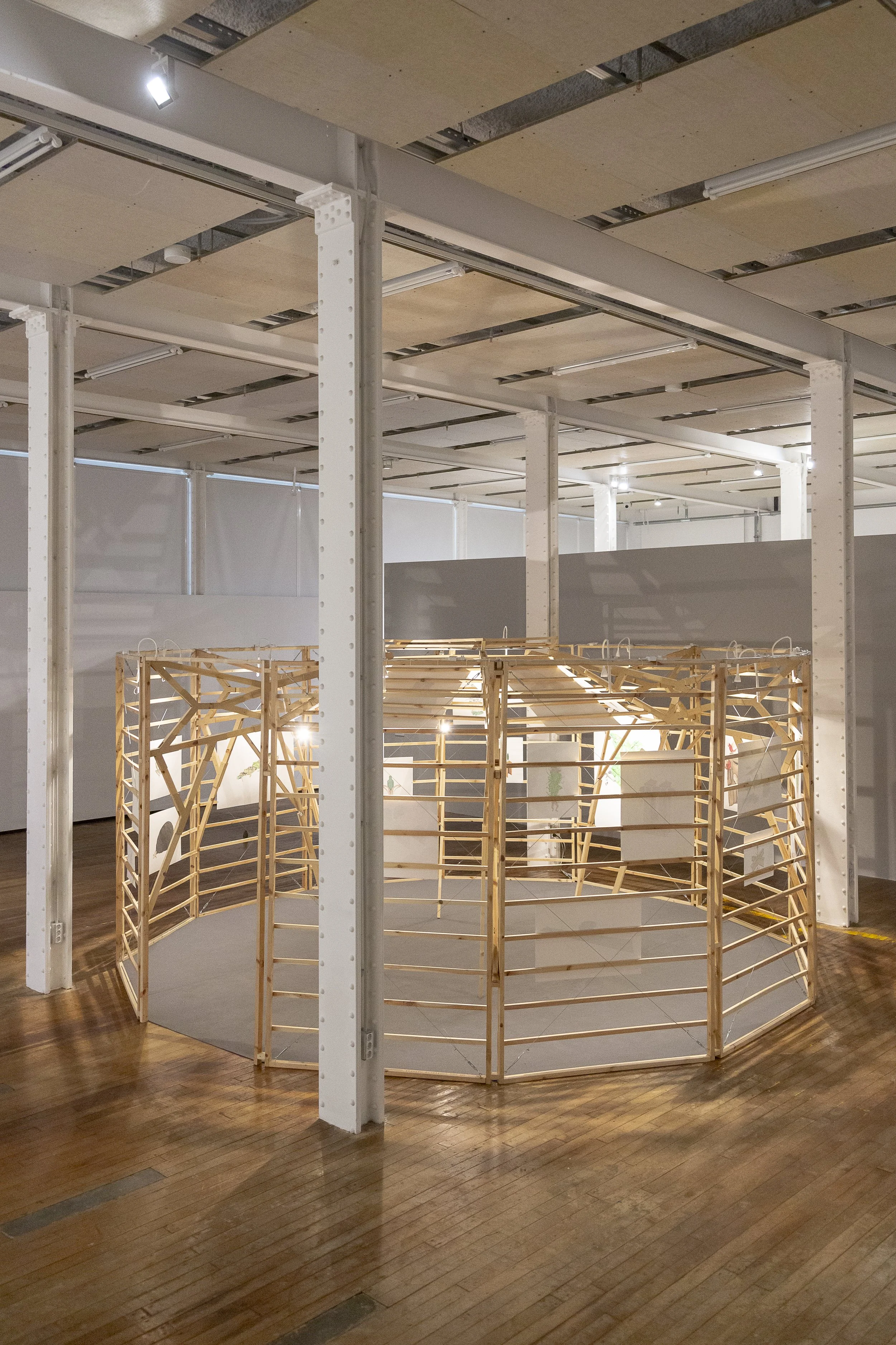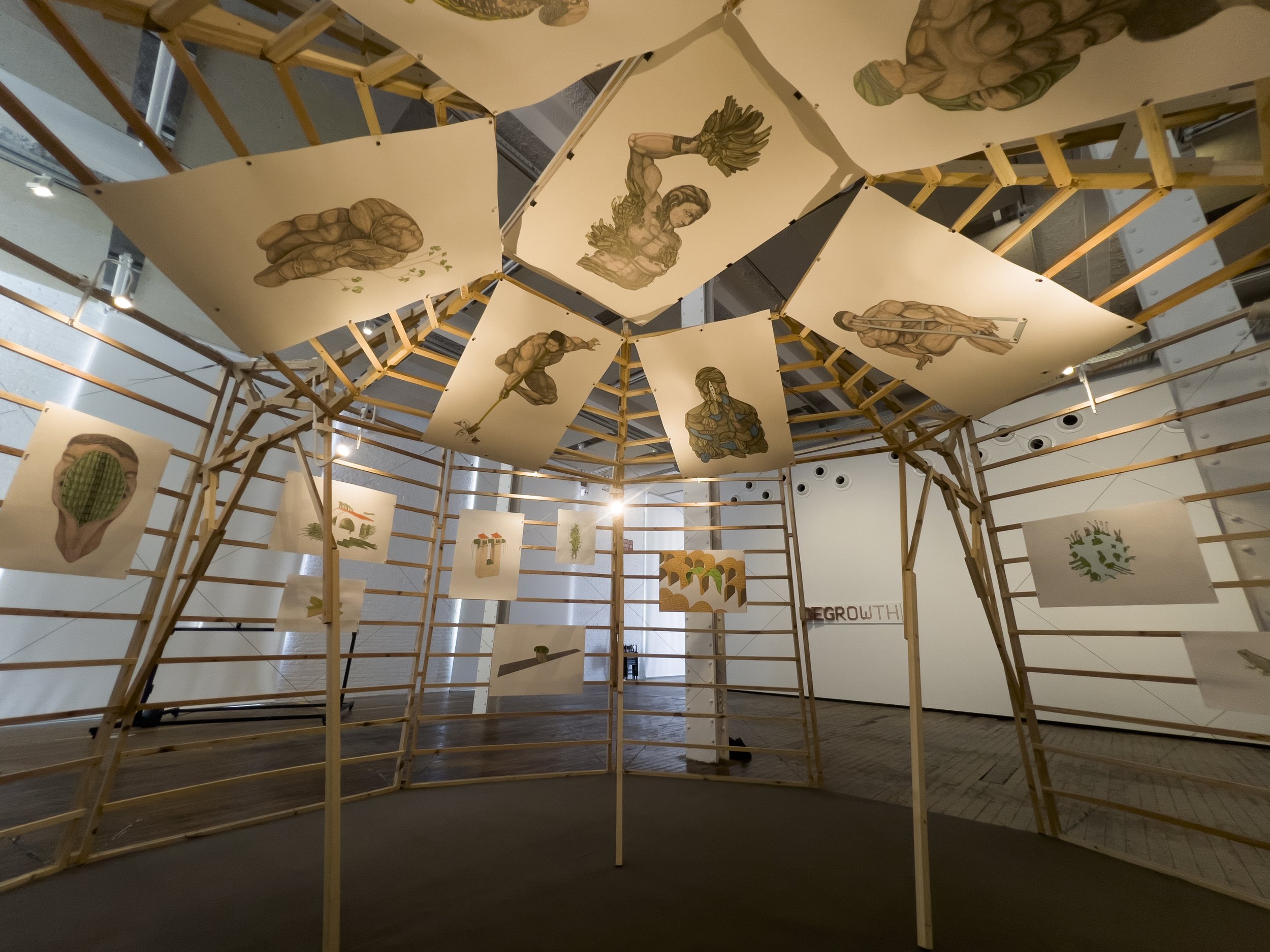 "The Domed Structure of the Terribleness of the Flesh, where Marc Herrero has recreated an updated version of the Last Judgment, inspired by Michelangelo's Sistine Chapel. If, in the Renaissance, the end of times was represented as an accounting before God, in this case the ultimate judge would be the goddess Gaia. In a domed structure, but one that also resembles a gym, a panopticon, or even a cage, Herrero proposes an iconographic repertoire of contemporary times: instead of apostles and saints, on the panels of the dome he represents allegories of the abuses that humankind has committed to provoke a more than probable, not-so-distant apocalypse. Consumerism, liberalism, exploitation, extractivism... are manifested as mutant bodily symptoms, in an attitude that is not quite clear whether it is harassment or a plea for forgiveness. At the base, on the contrary, he replaces the angels and penitents with a series of situations in which nature triumphantly breaks through, regains its agency, and infiltrates the footprints of civilization. In a situation of ecological collapse, we will only access salvation if we allow nature to invade and collapse all spaces, both earthly and those of the world of ideas."